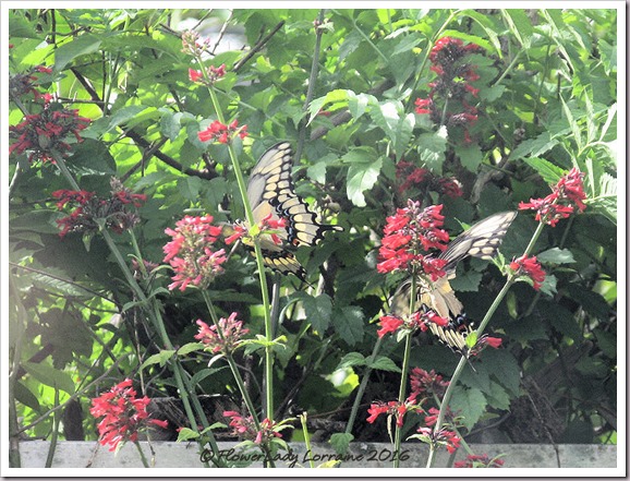 I was sitting here at my desk the other day and caught movement from the edge of my vision, and looked out the window and this is what I saw. The day was very windy, and the butterflies were continually on the move. These are a pair of Giant Swallowtail butterflies, probably mating, as they are usually flying solo. Needless to say, I was thrilled. The one to the right has a huge bite out of one wing.